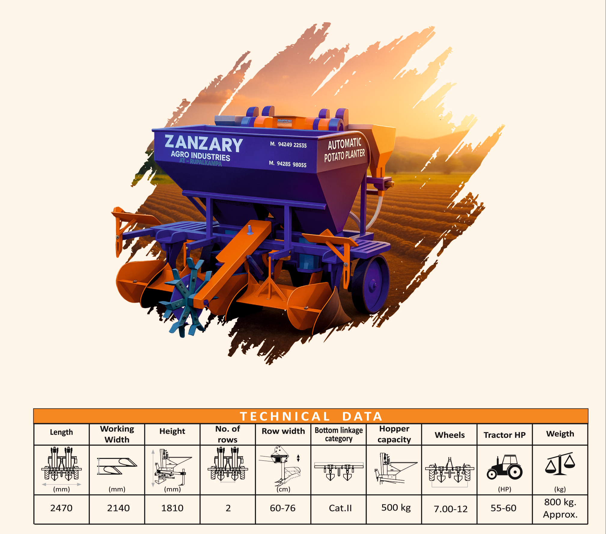 The Automatic Potato Planter by Zanzary Agro Industry is engineered to combine durability with efficiency. Every feature is designed to save seeds, reduce labour, and ensure uniform plantation for a healthier and more productive harvest.